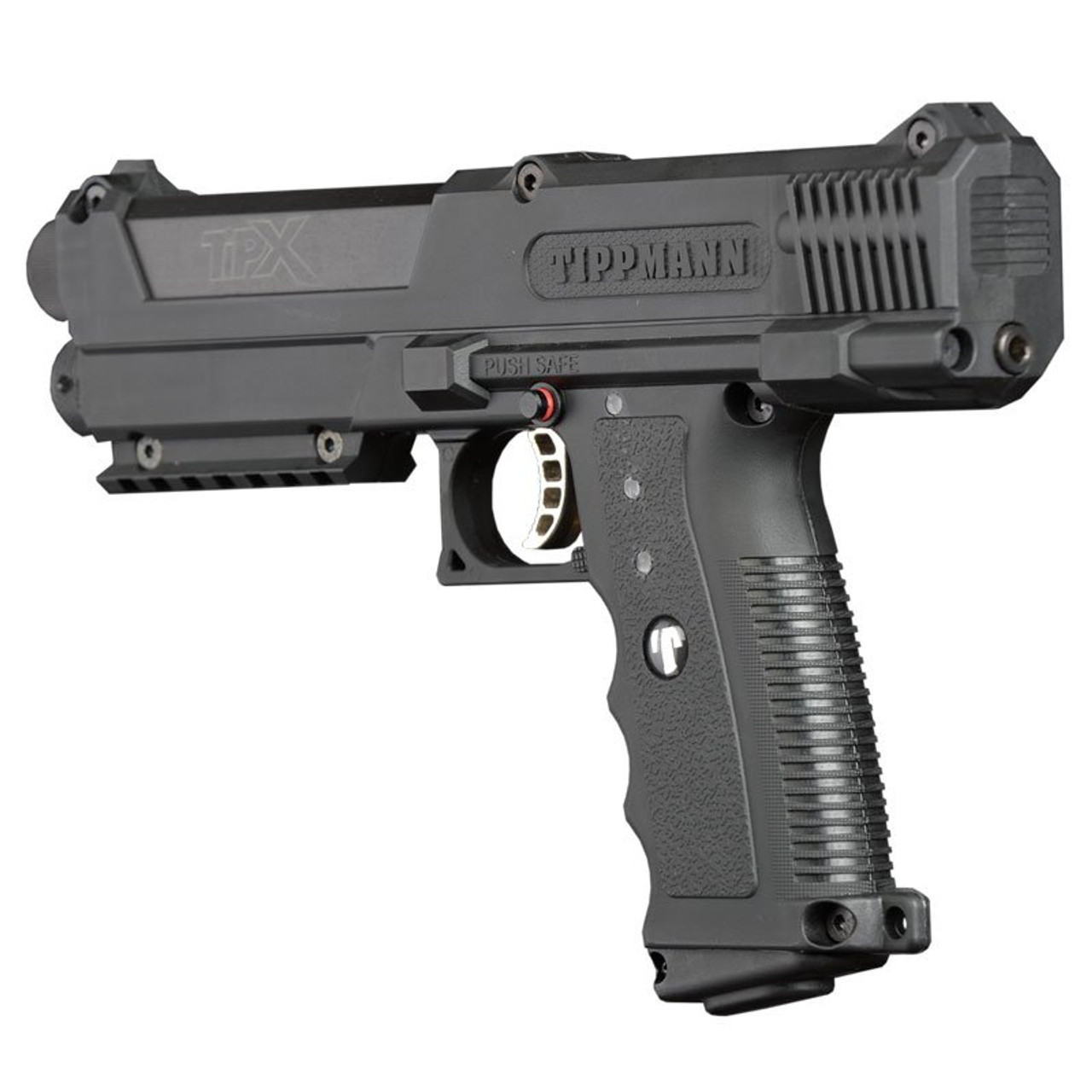 TiPX Deluxe Pistol Kit includes the TiPX black pistol, a black Tippmann Reversible Holster and 3 Tru-Feed Magazines.